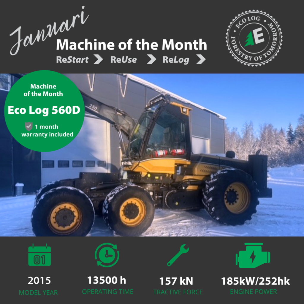 In January, we highlight a well-maintained Eco Log 560D from 2015, equipped with Log Max 5000D – a smooth and reliable harvester designed for efficient work in varied terrain.